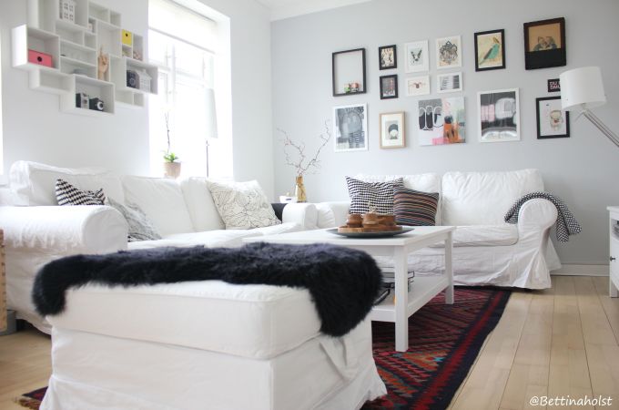 Der skal flere farver til i stuen og jagten er sat ind på nye pudebetræk. De nuværende skal bibeholdes, der skal bare flere til. Den store dronningestol du ser i forgrunden på sidste billede, bliver skiftet ud med en mere moderne stol idag.