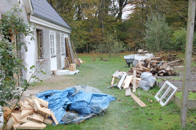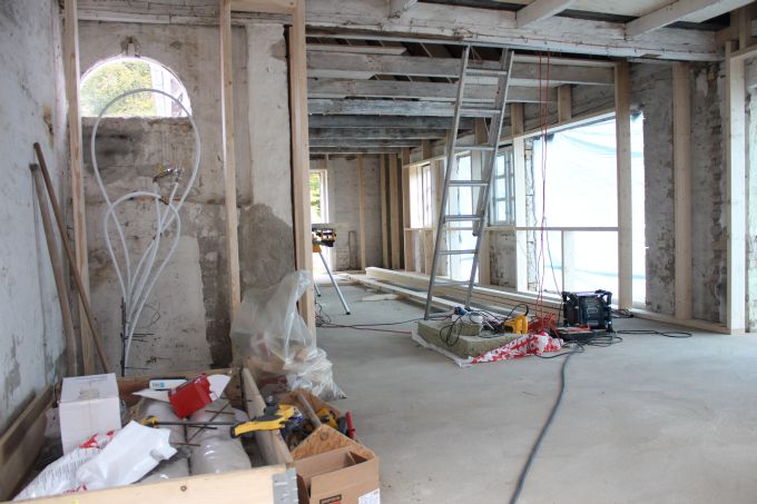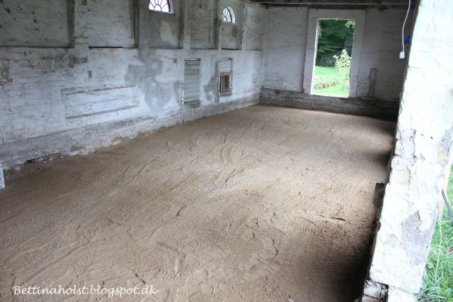 Der er banket ½ meter gammelt betongulv op og jord er gravet væk. Nyt betongulv er blevet støbt. Varmerør trukket. Isolerering i gulvet er lavet.