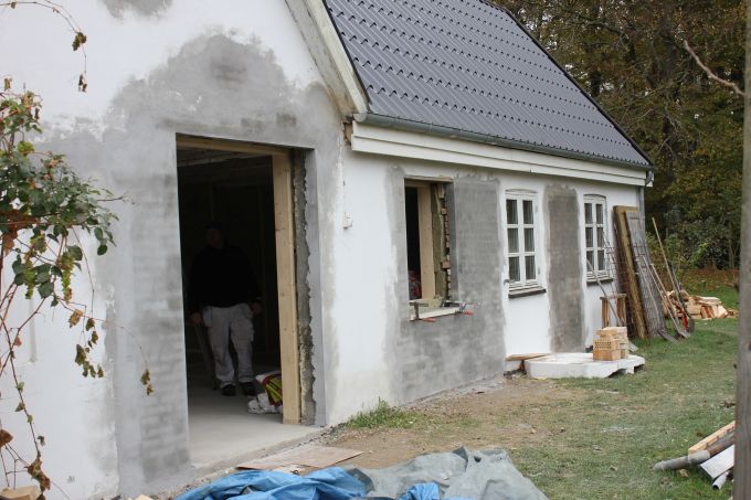 Desværre måtte de gamle staldvinduer lade livet. Det ville simpelthen blive alt for dyrt at renovere dem og montere skelet omking dem. Mureren bankede dem meget forsigtigt ud “for han havde fået ordre fra Thomas om, at “Bettina nok kan bruge dem på anden måde”..heee.
