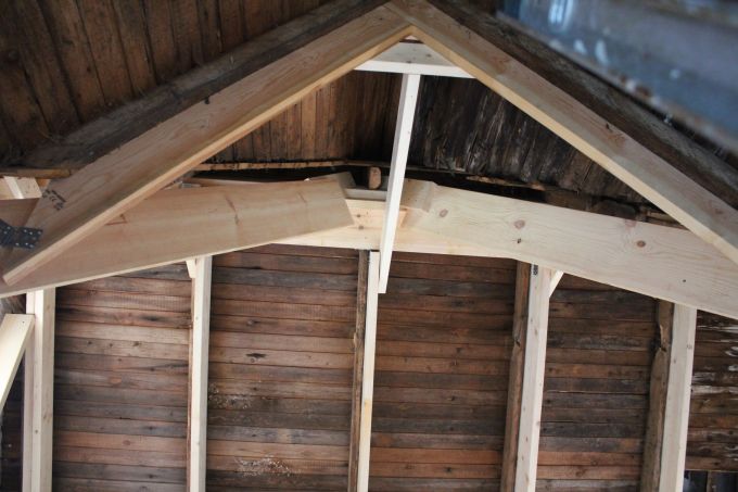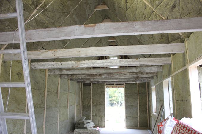 Det har taget tømreren lang tid at lavet skelettet til de nye vægge. Især fordi det er gamle og skæve vægge. Og specielt ovenstående billede, hvor vinklen på loftet skulle mødes og fordi der nedenunder er blevet væltet en bærende mur.